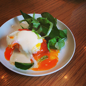 ![]() 収穫した野菜や芋は店内で料理人によってその場で調理。500Wの電子レンジで30秒で調理した目玉焼きを使ったエッグベネディクトの実演調理。 |