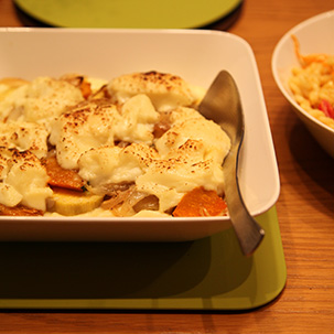 ![]() オーブンレンジで焼き上げている様子です。様々な使い勝手が可能なことに調理スタッフの方も驚いていました。 |