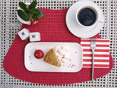 街もそろそろクリスマスの装い。引き出しの奥の真っ赤なプレイスマットを出そうかな。アップルタルトには生クリームとアラザン。せっかくのケーキは思いっきり楽しみたいから、長角のプレートをキャンパスに盛りつけ。