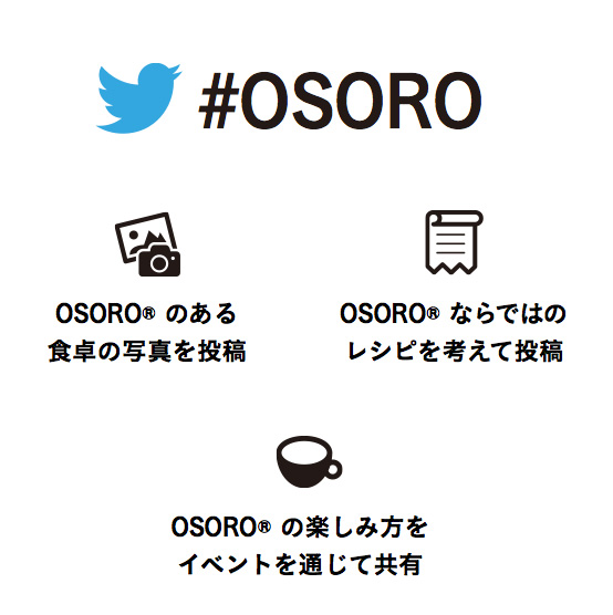 <活動内容> OSORO®のある生活をTwitterでツイートしてください。 例えば、 ・OSORO®を使って盛りつけた食卓風景 ・OSORO®を使ったパーティースタイル ・OSORO®で作ったお料理のレシピ など。 ちょっとした日常を切り取って発信すればOK。 OSORO®から広がる新しい暮らし楽しんでください。